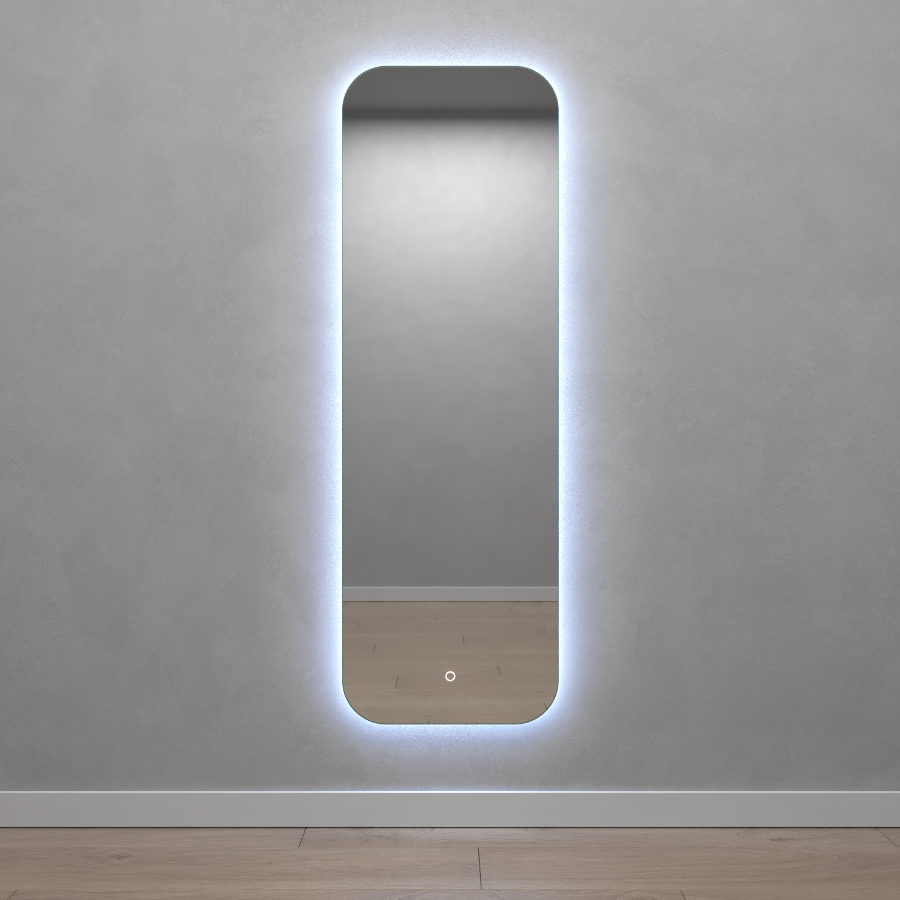 Безрамное зеркало прямоугольной формы с контурной (тыльной) холодной подсветкой, свет 6000К. Подложка из высококачественного МДФ, светодиодная лента защищена матовым свето-рассеивателем от попадания пыли и влаги. Есть вывод 220W для подключения к сети, включение подсветки от сенсорной кнопки на зеркале, её расположение на зеркале можно выбрать на заказ.